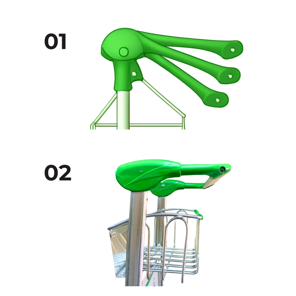 The push handle of hand friendly EXLAN releases the brake by moving up or down. The handle integrates pictograms with user and safety instructions. The basket‘s handle aids in the steering of the cart and increases the handling comfort